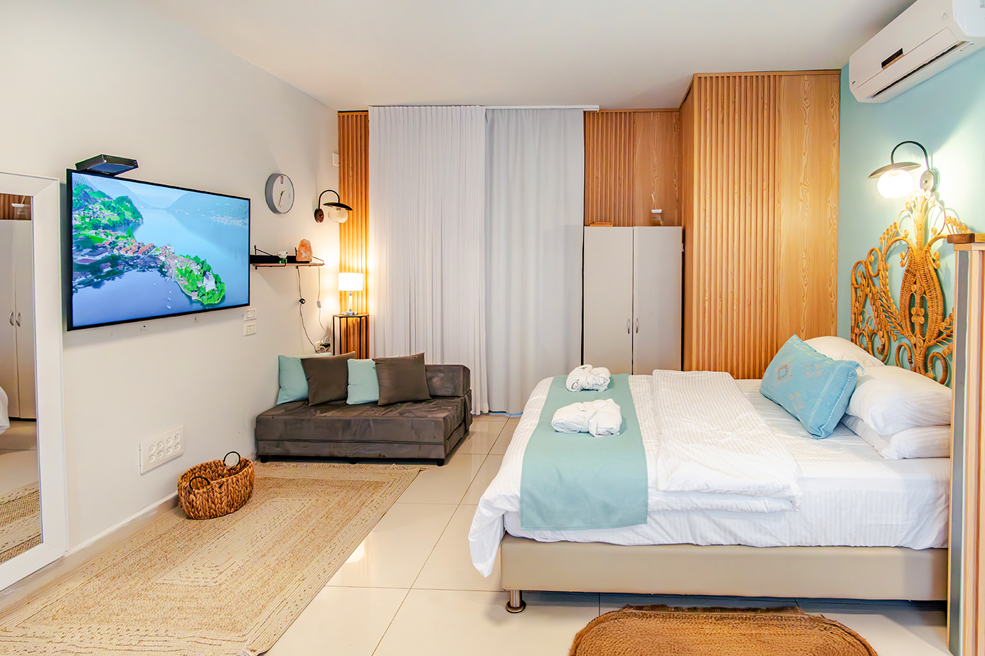 היחידה מעוצבת בסגנון רטרו בצבעים רכים ומזמינים שמשרים רוגע ונועם.