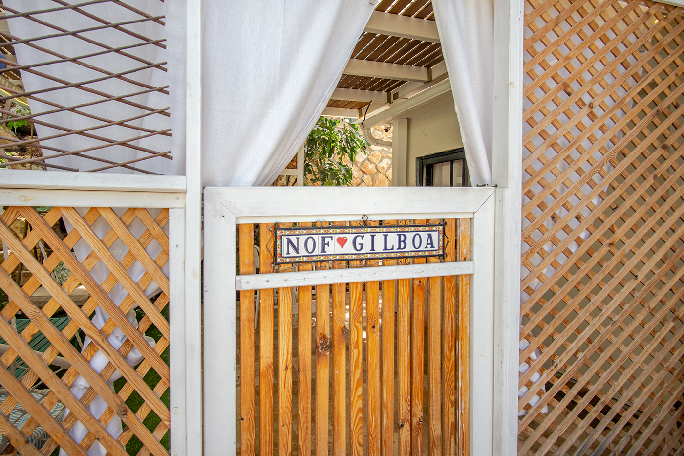 יחידת בוטיק ממנה נשקף נוף הגלבוע התלול, טובל בתוך עצי פרי אקזוטיים.