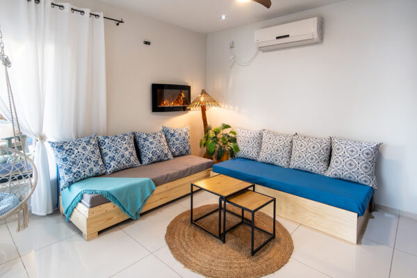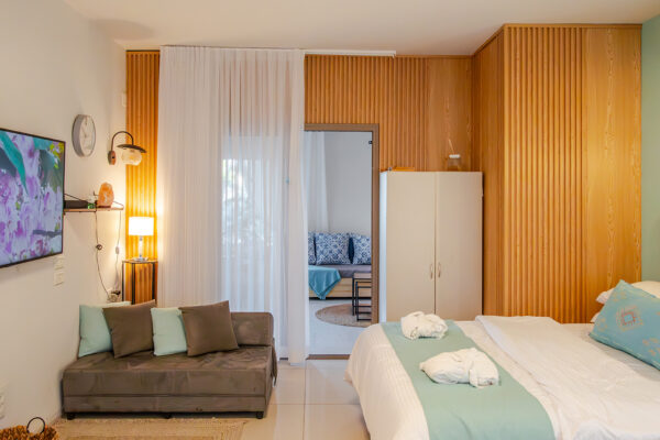 מתחם שינה נפרד/נוסף– רלוונטי ליחידת נוף העמק בלבד. ( גודלה כ- 20 מ"ר) יכולה לשמש כסלון, או כחדר שינה עם מיטות נפתחות למיטה זוגית 160/190 ומיטת יחיד 80/190 , ניתן להוסיף מיטת יחיד 80/190 נוספת , כך שסה"כ אורחים ביחידה הנוספת יעמוד על 4.